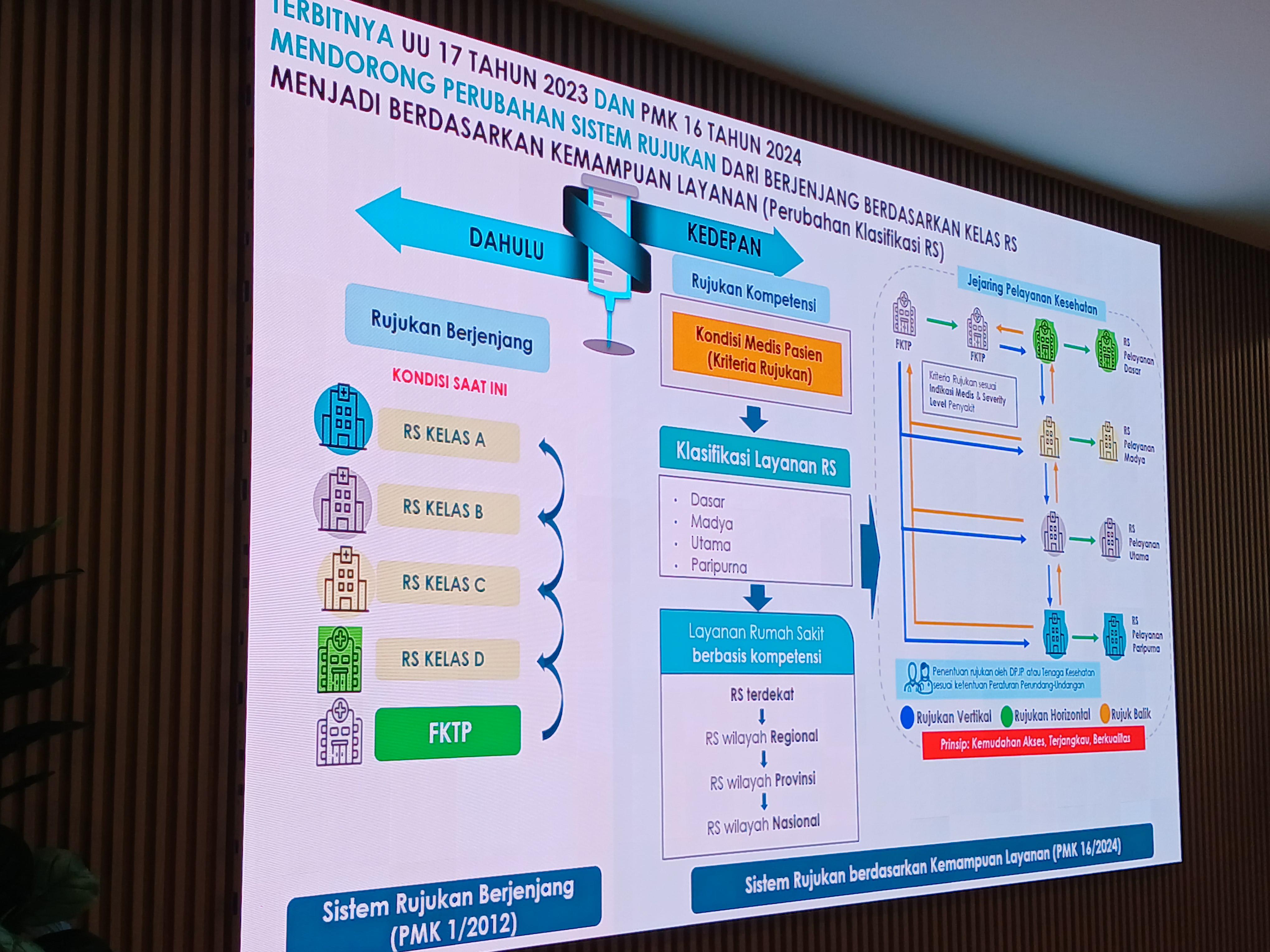 Pemerintah mengumumkan rencana penghapusan sistem rujukan berjenjang dan menggantinya dengan rujukan berbasis kompetensi. Melalui sistem baru ini, peserta Jaminan Kesehatan Nasional (JKN) akan langsung diarahkan ke rumah sakit yang kompeten (mampu) menangani kondisi medisnya, tidak lagi berjenjang berdasarkan kelas D–C–B–A.