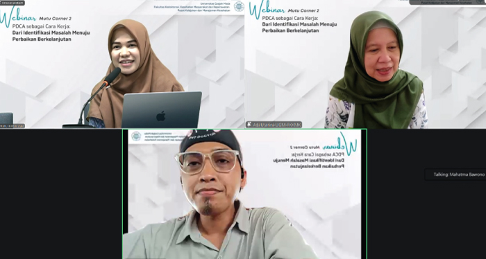 PKMK-Yogyakarta. Webinar Mutu Corner seri kedua mengangkat tema “PDCA sebagai Cara Kerja: Dari Identifikasi Masalah Menuju Perbaikan Berkelanjutan” sebagai upaya memperkuat pemahaman praktis tenaga kesehatan dalam mengimplementasikan siklus mutu secara nyata di lapangan. Kegiatan ini menghadirkan Prof. dr. Adi Utarini, M.Sc., MPH, Ph.D. dan dr. Mahatma Sotya Bawono, M.Sc., Sp. THTBKL selaku narasumber, serta Andriani Yulianti, MPH dari Divisi Manajemen Mutu PKMK FK-KMK UGM sebagai moderator.