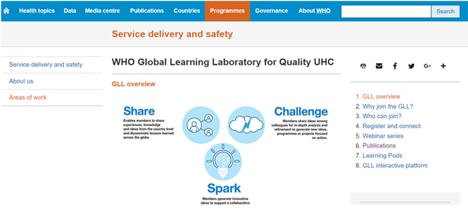 Gambar: Tampilan web WHO Global Learning Laboratory for Quality UHC (http://www.who.int/servicedeliverysafety/areas/qhc/gll/en/)